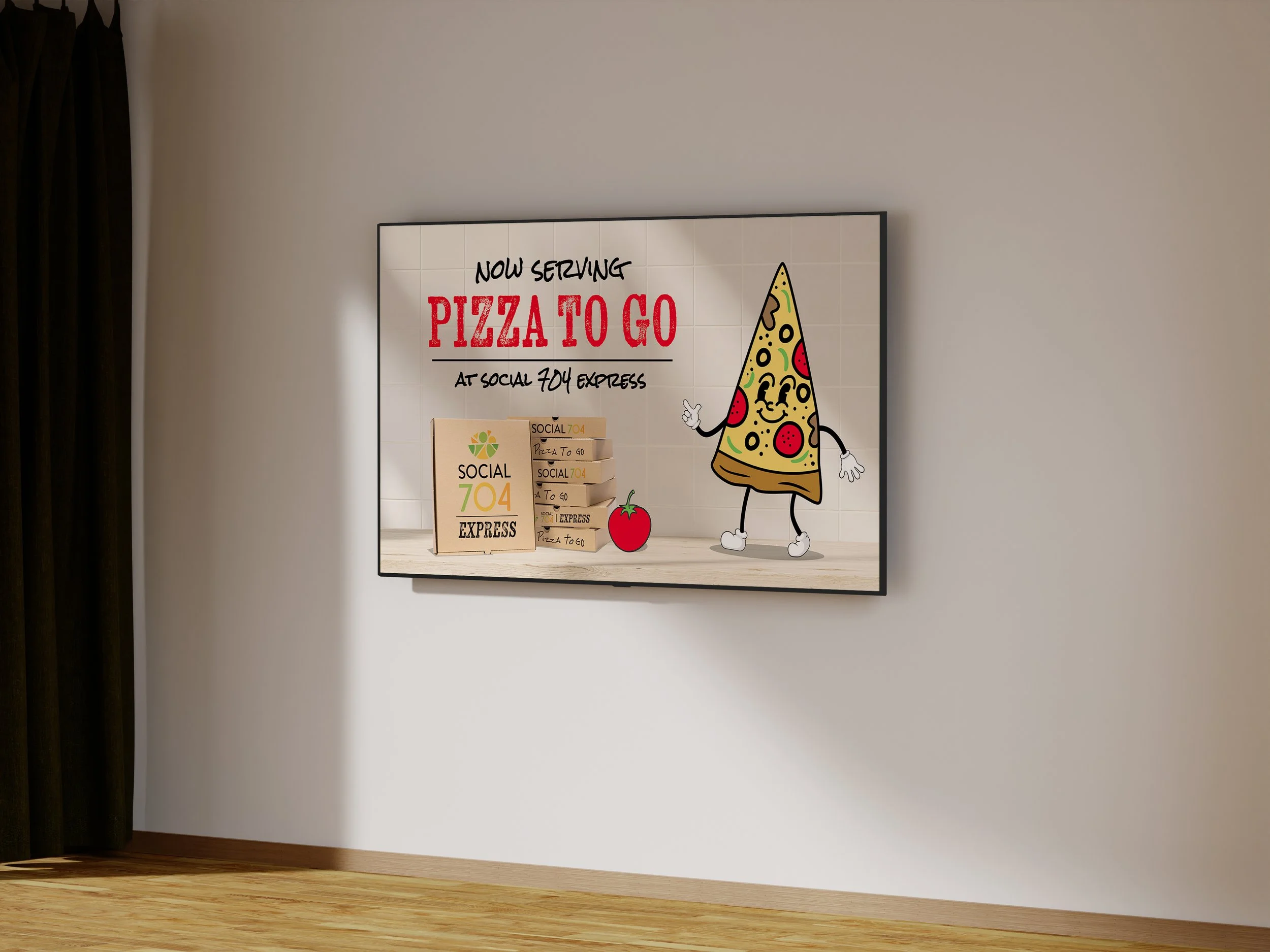 A digital sign in a room advertises Pizza to Go at Social 704 Express, featuring a cartoon of a slice of pizza giving a thumbs up, with boxes of pizza, a tomato, and text promoting the pizza service.