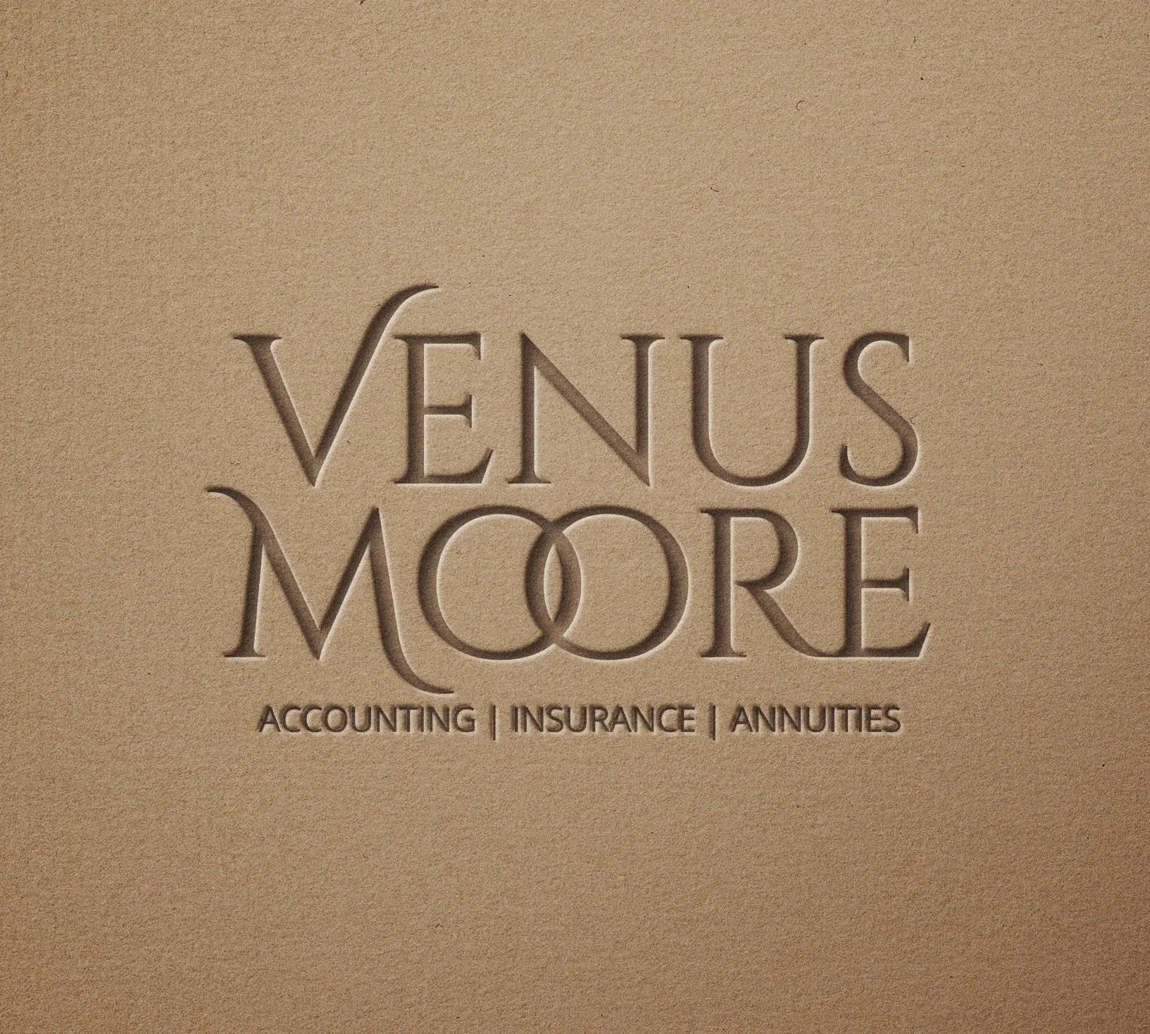 A sign with the name 'Venus Moore' in large letters, and the words 'Accounting,' 'Insurance,' and 'Annuities' below, on a beige wall.